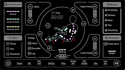 MA201 Massage Chair features an intuitive LCD touchscreen that lets you easily choose between automatic and manual modes. With just a tap, you can customize the massage experience by adjusting the intensity of the massage, airbags, and movement position. The user-friendly interface provides full control, allowing you to tailor every session to your preferences for a personalized, comfortable massage experience.