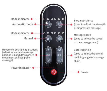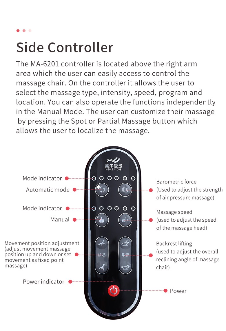 The MA-6201 controlleris located above the right arm area which the user can easily access to control the massage chair.on the controller it allows the user to select the massage type, intensity, speed, program and location. You can also operate the functions independently in the Manual Mode. The user can customize their massage by pressing the Spot orPartial Massage button which allows the user to localize the massage.